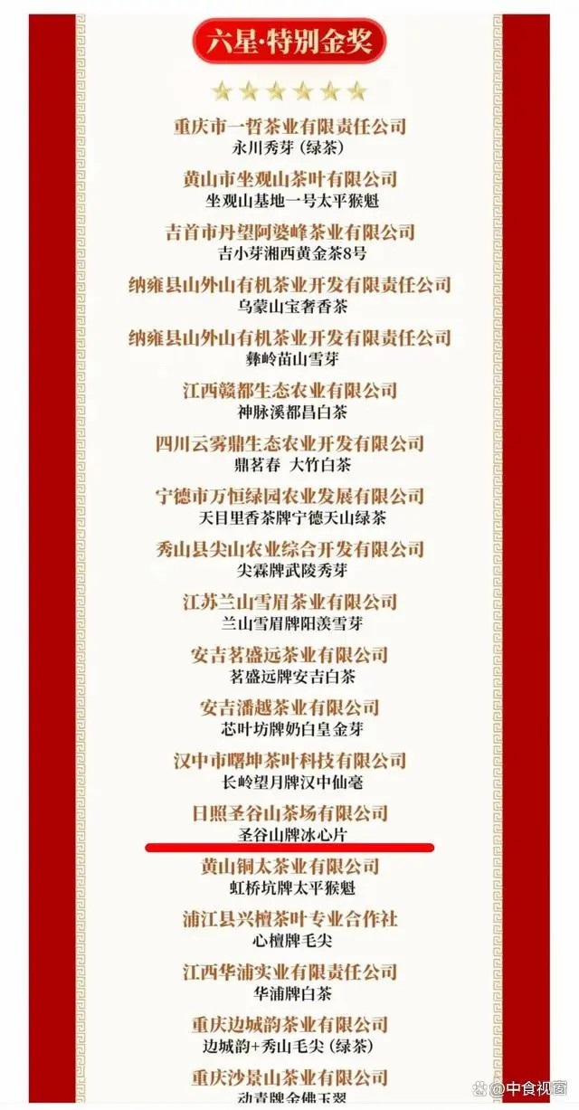近日,“中茶杯”第十四屆國際鼎承茶王賽·春季賽獲獎(jiǎng)名單揭曉,圣谷山牌“冰心片”入選綠茶組獲獎(jiǎng)名單,獲評(píng)六星·特別金獎(jiǎng),日照圣谷山茶場為山東唯一獲此殊榮茶企。